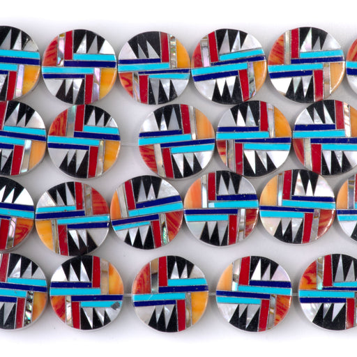 These detailed inlay coin beads have a variety of stones such as Coral, Mother Of Pearl, Turquoise, Lapis, and Jet.