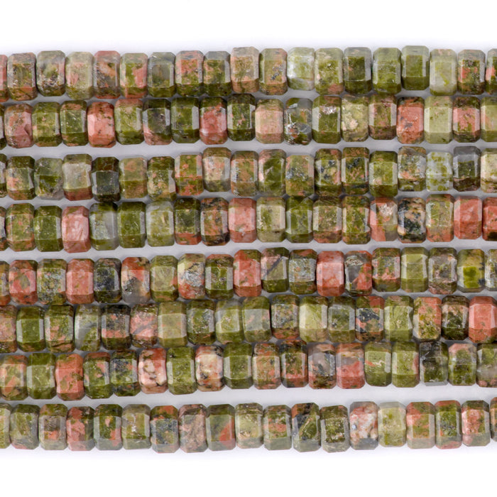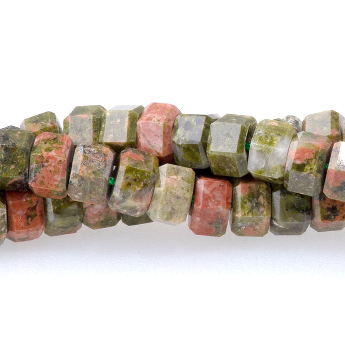 Unakite is a granite composed of pink Feldspar and Epidote, creating a beautiful blend of pink and green in mottled patterns. The colors in this stone can range from pistachio to moss green with areas of pink, peach or light red and may also include colorless Quartz. It was first found in the Unaka Mountains in Tennessee and North Carolina, from which its name was derived.