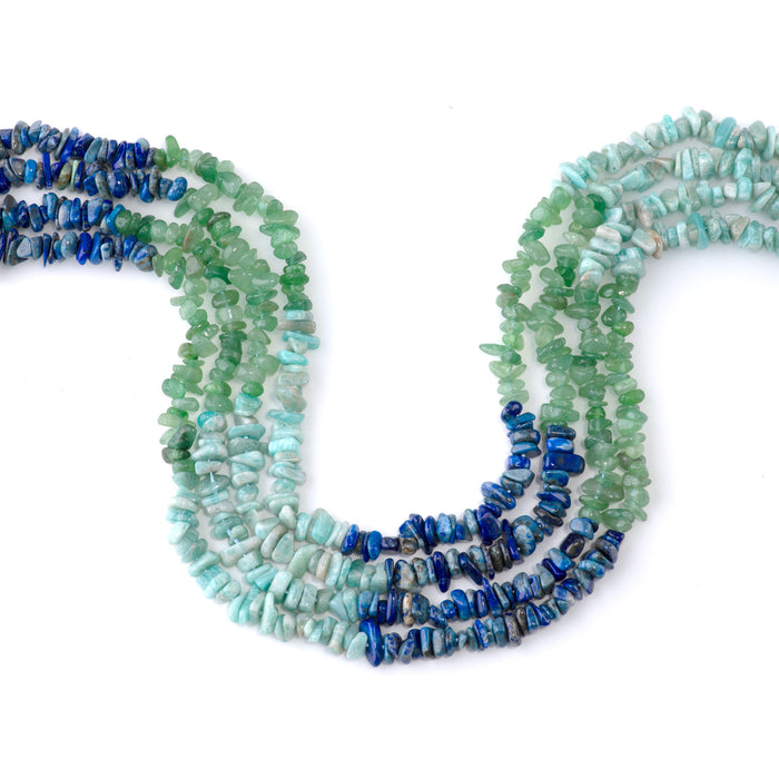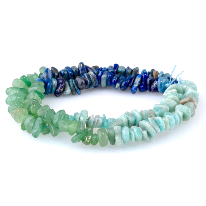 This banded strand of chips features Amazonite, Green Aventurine, and Lapis