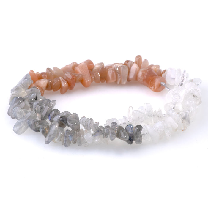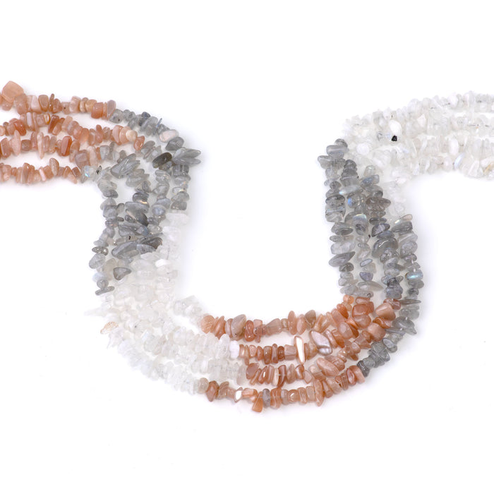 This banded strand of chips features Labradorite, Peach Moonstone, and Moonstone.